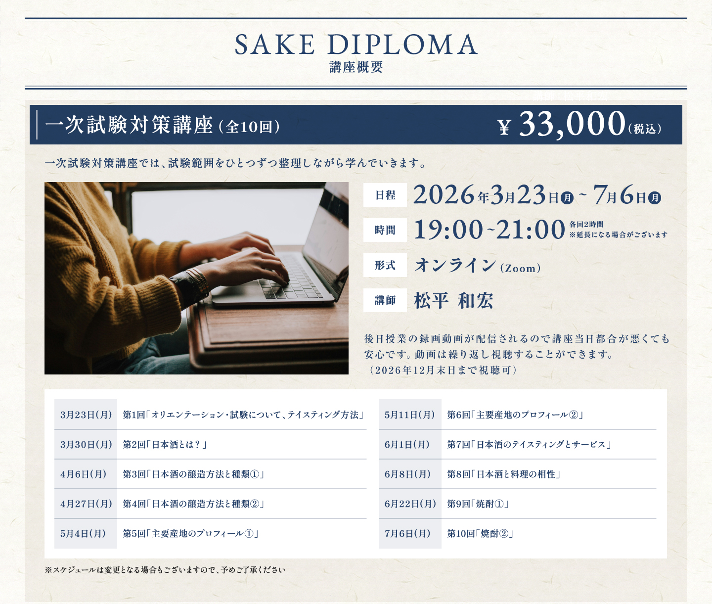 日本酒に関する試験対策コース 2026年度 SAKE DIPLOMA【全10回】 一次試験対策講座講師 松平 和宏 2026.01.27 お申し込みはこちらから 【SAKE DIPLOMA試験対策講座】詳細はこちらから 2026年度 SAKE DIPLOMA試験対策講座 講師 松平 和宏 前の記事 2026年度 SAKE DIPLOMA【全3回】 テイスティング基礎講座 講師 松平 和宏 次の記事