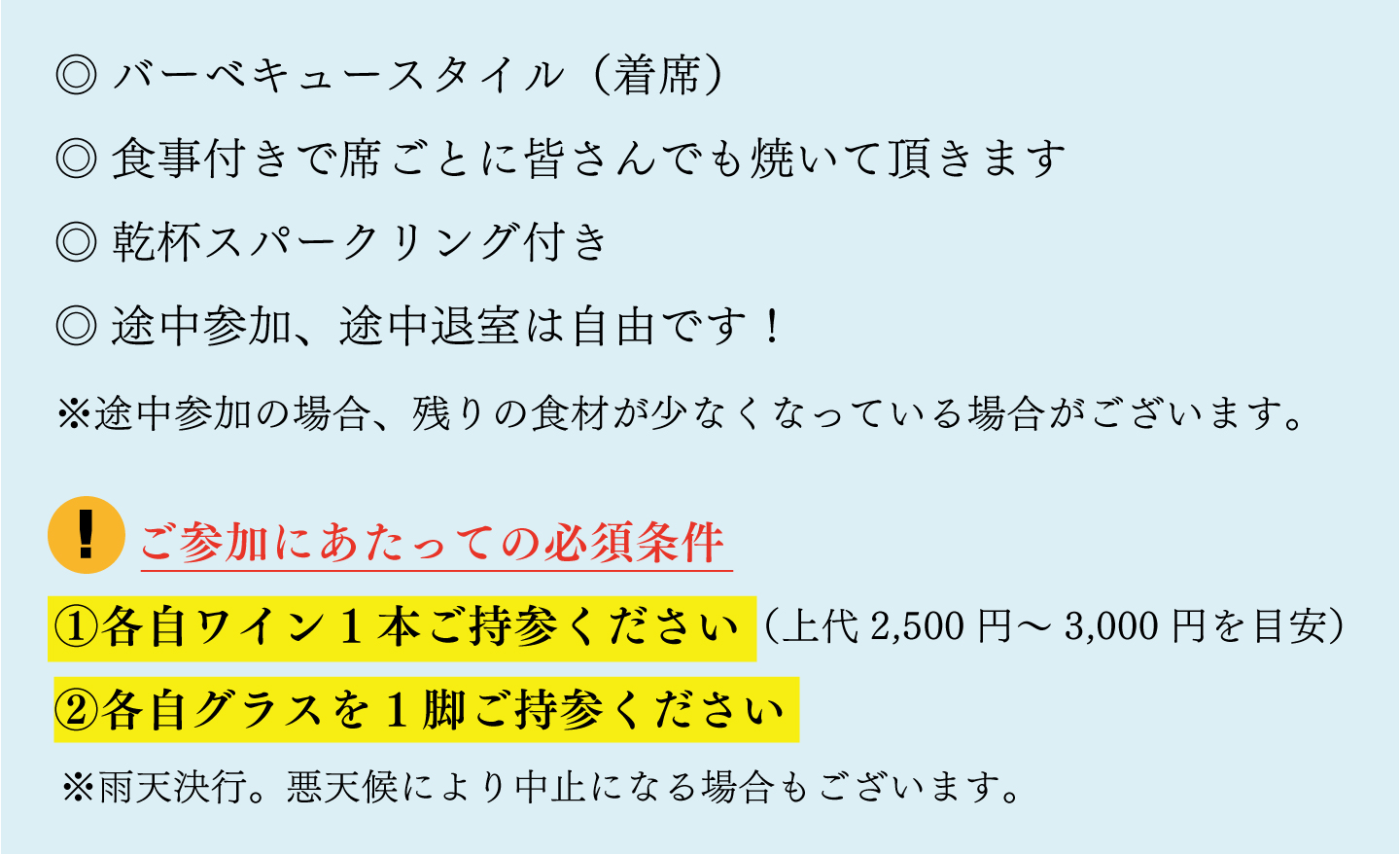 ・当日はバーベキューの様子を映像・写真撮影させていただきます。撮影した映像や写真は、今後の当イベント開催時、ホームページ、SNS、イベントの告知等に使用させていただきます。