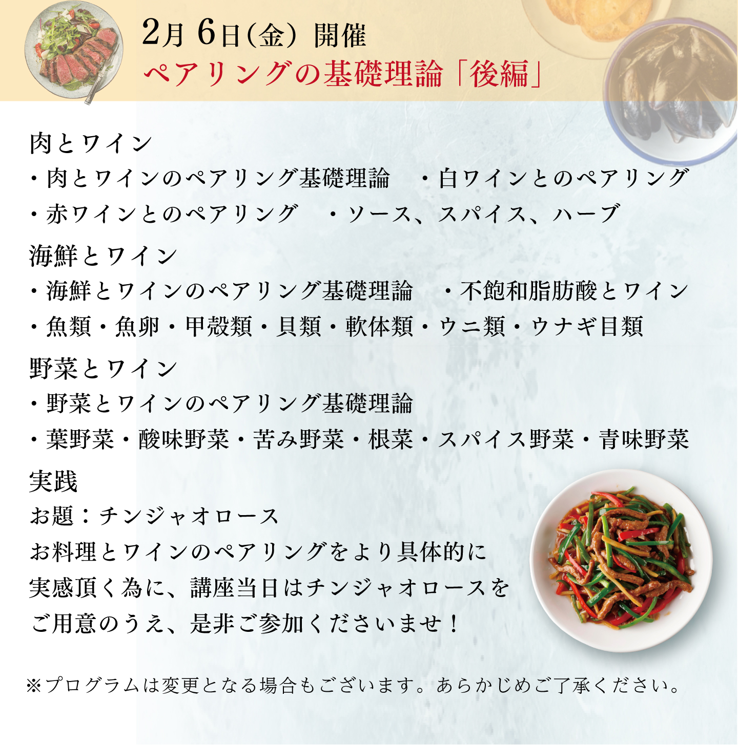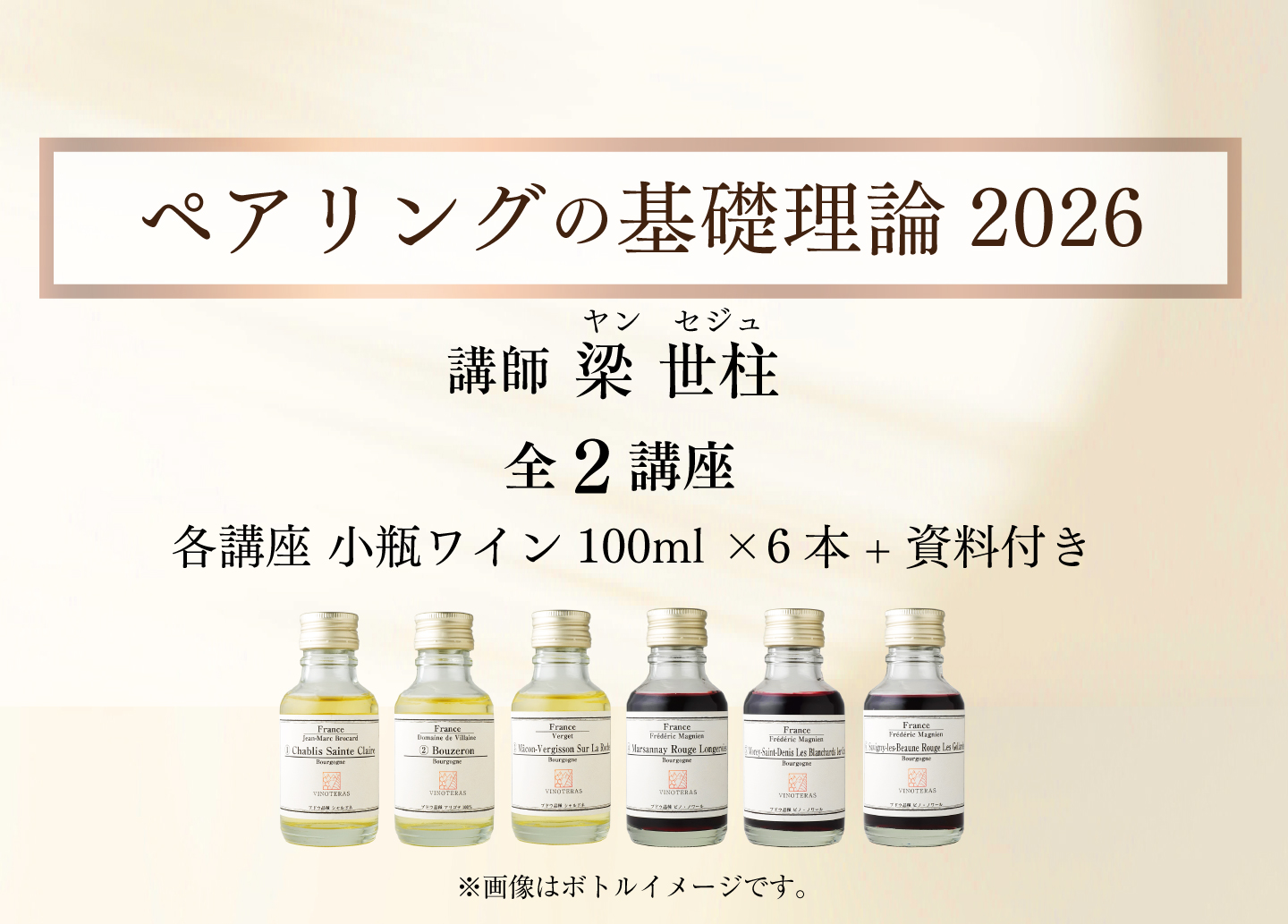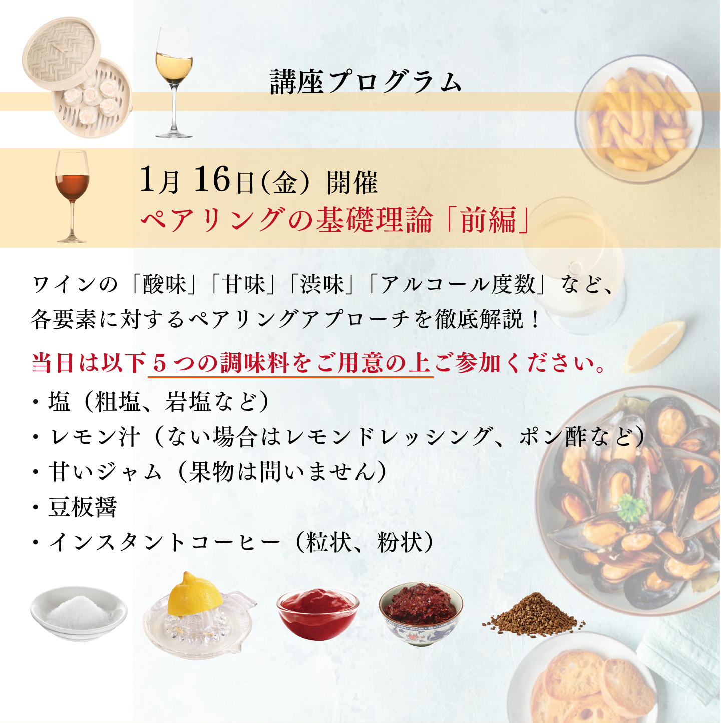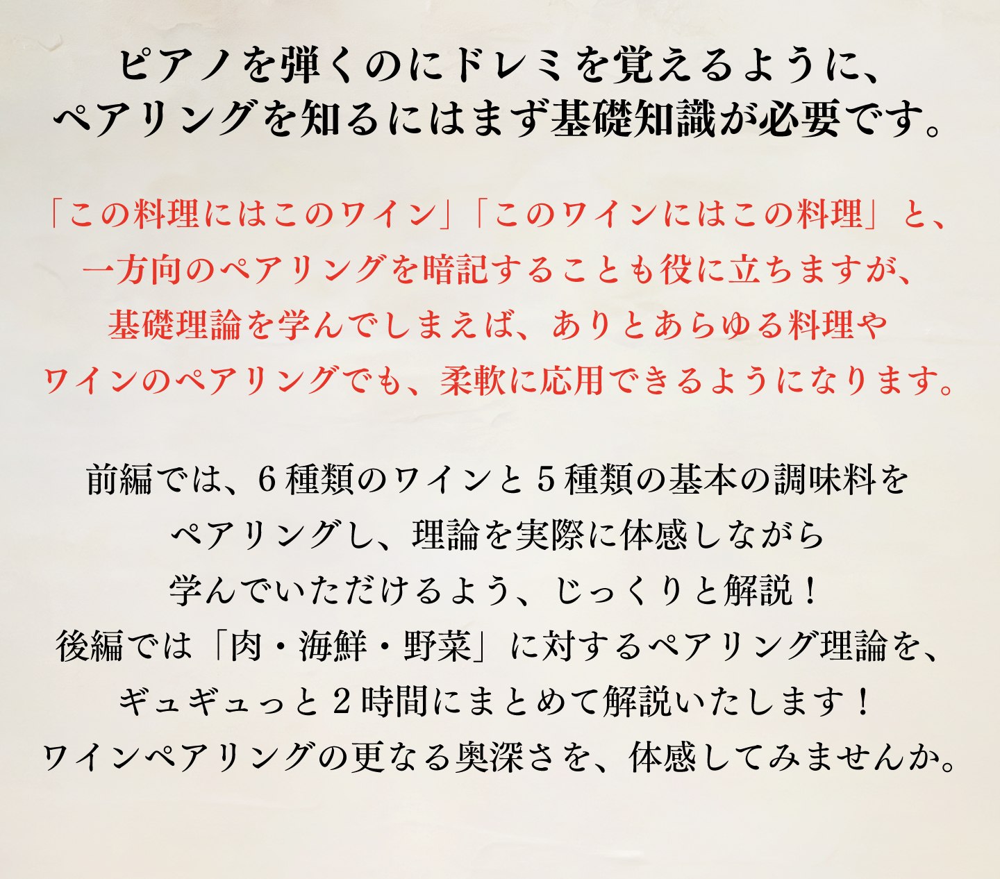 具体例を交えた丁寧な説明やニッチな話題はとても興味深く聞けました。また質問にも詳細にお答えいただき良かったです。基礎を学ぶことでこれまで何となく行なってきたペアリングが一歩前進し明日からのワインライフがさらに充実すると思います。