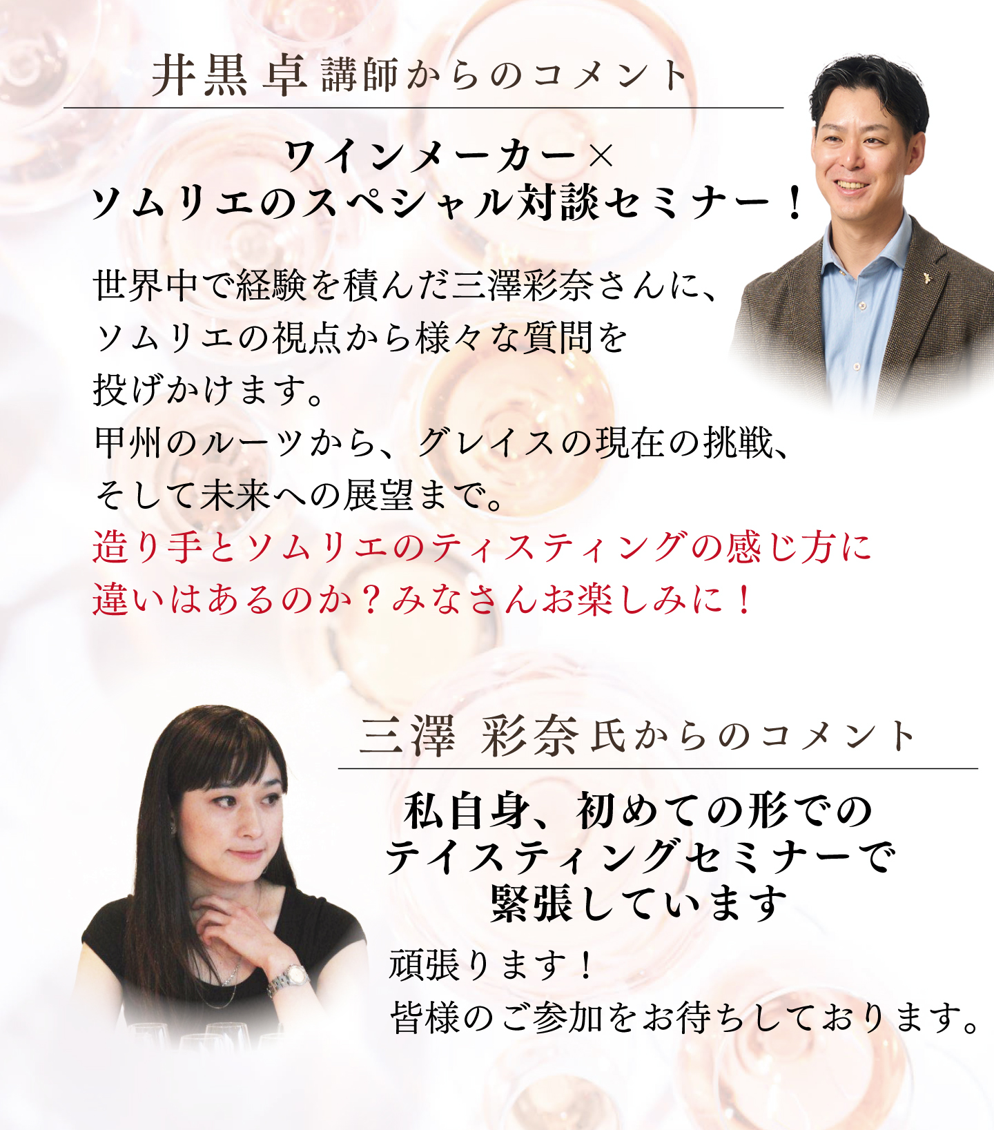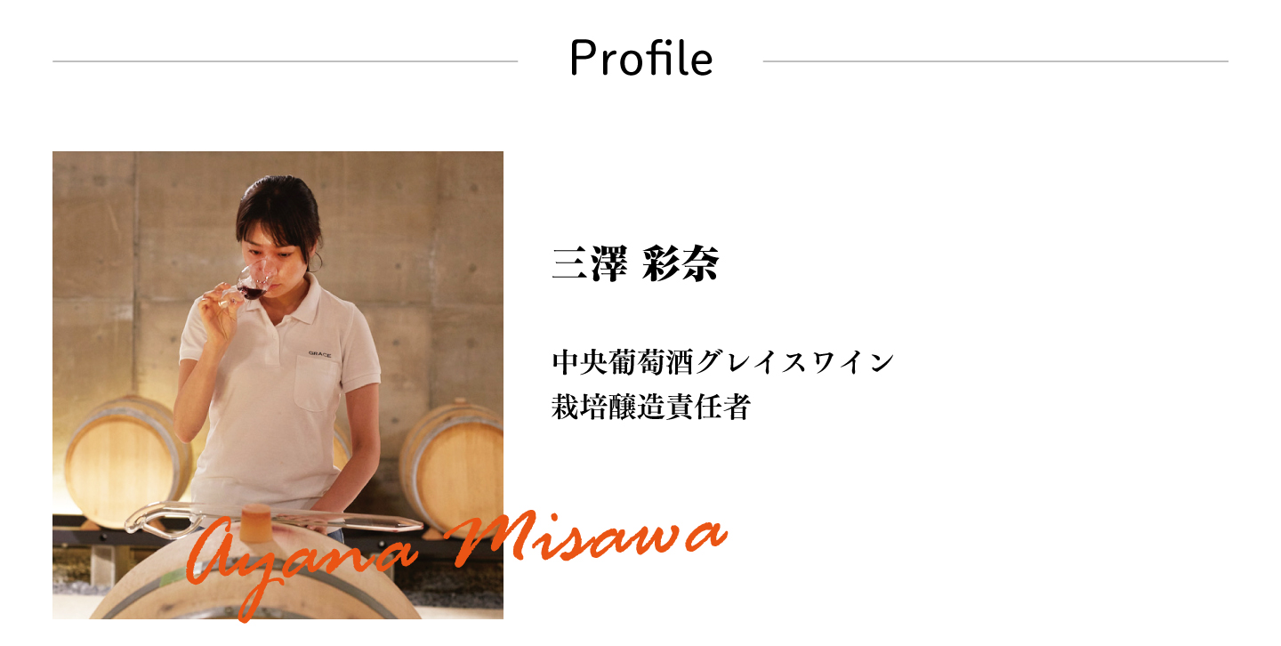 中央葡萄酒株式会社:4代目オーナー三澤茂計の長女として生まれ、幼い頃からワイン造りに親しむ。単身渡仏し、ボルドー大学でワイン醸造について学ぶ。